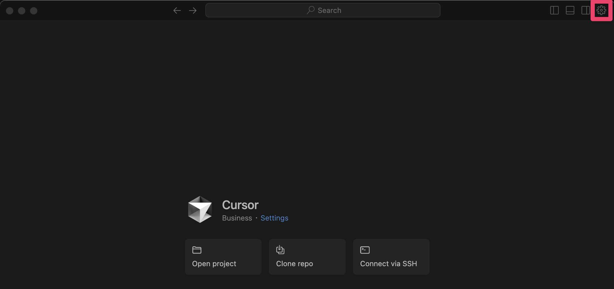 Open Cursor and navigate to the settings panel in the top right corner